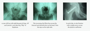 11 year old boy with right hip pain & limp. AP and Lateral x-rays showing “Slip” of Epiphysis